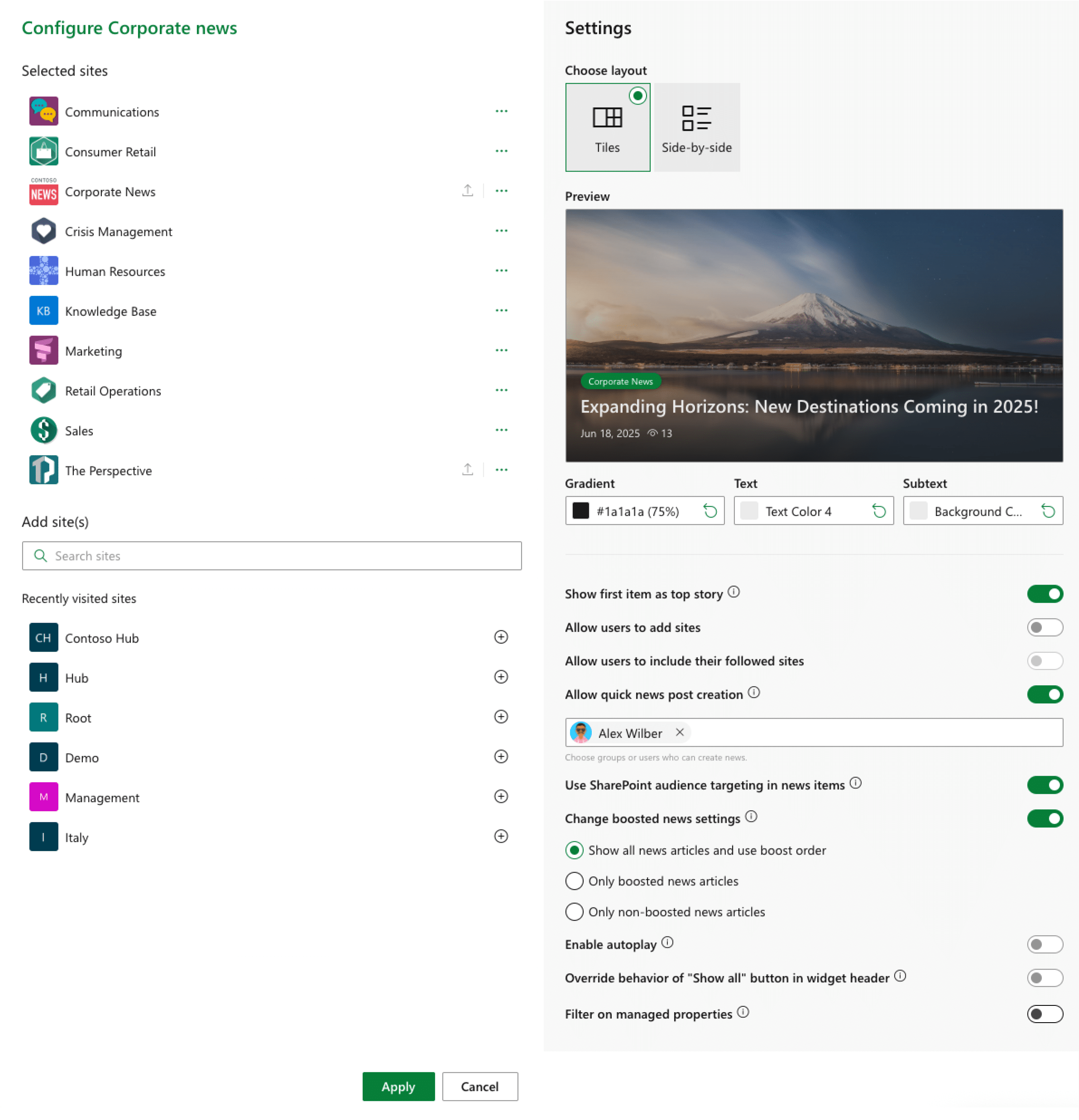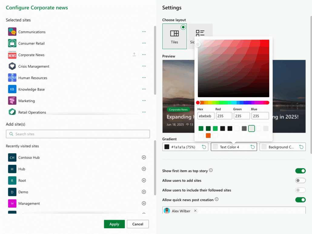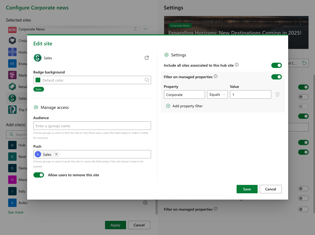 Each news source comes with its own set of flexible options. You can control which users see which sites by setting audience targeting, apply push rules to promote specific sites to certain groups, and even allow users to remove sites from their view. Use managed property filters to refine content—for example, only pulling in news marked as “Corporate.” You can also define a badge color per site to visually distinguish sources, helping users scan and recognize content faster. Whether you’re curating news for the entire organization or a specific team, site-level settings give you the tools to deliver the right content to the right people.